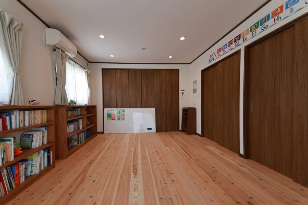 ← 赤い屋根の平屋の家、写真のような看板があります