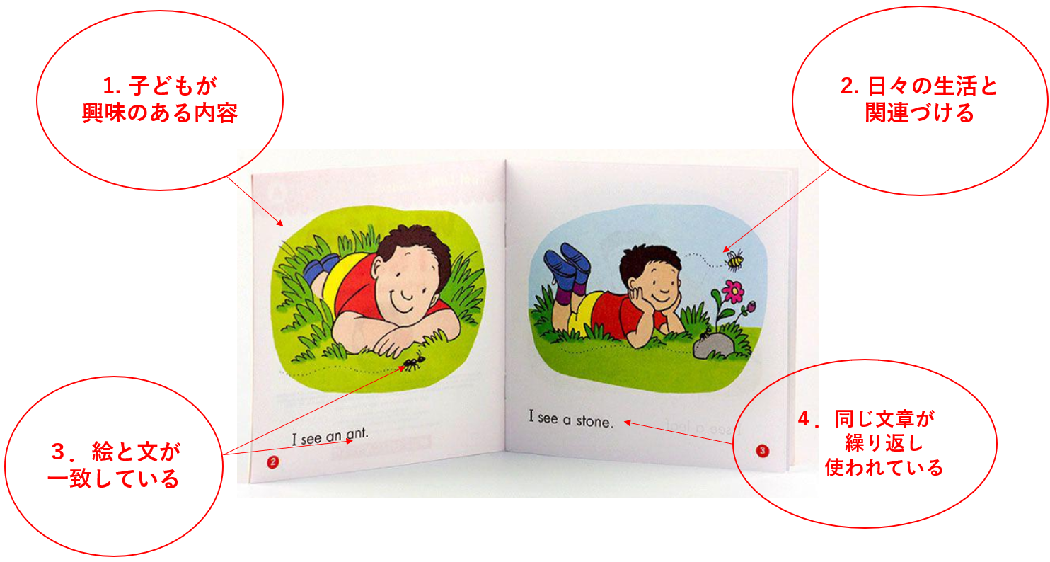 上の写真で「I see an ant.」という英文があります。絵の中にアリさんがいるので、「ant」は「アリさん」ということに子どもは気づきます。子供は、大人と違い情報量が少ないので、絵などのビジュアルで言葉を覚えていきます。よって、絵をみて文が理解できる絵本を選ぶことがとても大事です。