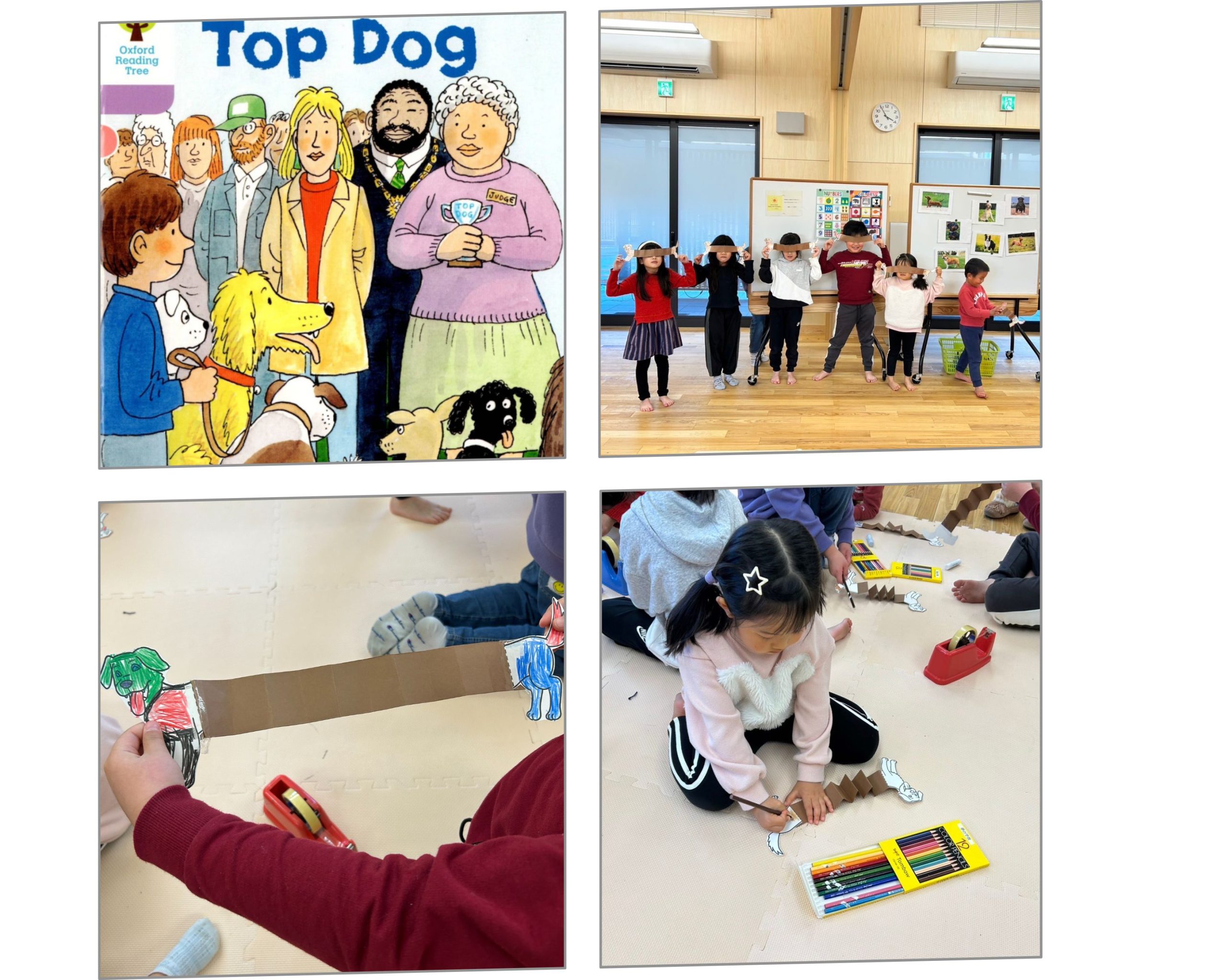 1月11日(土)のはじめてのえいかいわでは、いろんな「ワンちゃん」を題材に、子どもたちにどんどん表現してもらいました。(夢の学習で毎月2回開催)