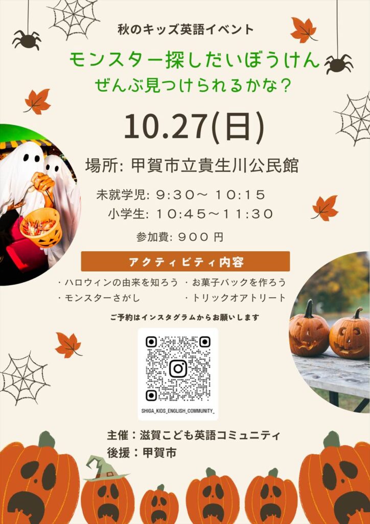 こんにちは!滋賀こども英語コミュニティですより10月27日(日)に甲賀市立貴生川公民館で開催する「モンスター探しだいぼうけん」のご案内です。秋のキッズ英語イベントとして、ハロウィンをテーマにした楽しいアクティビティをたくさんご用意しています...